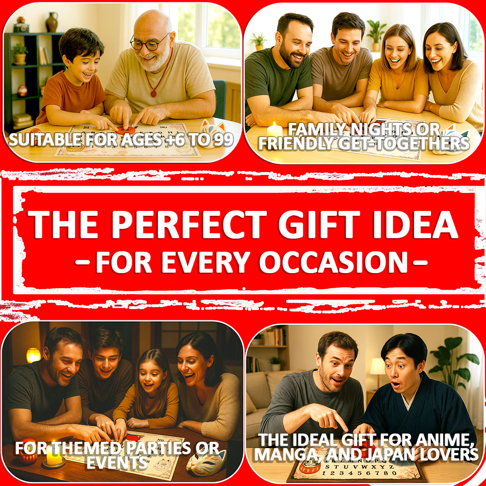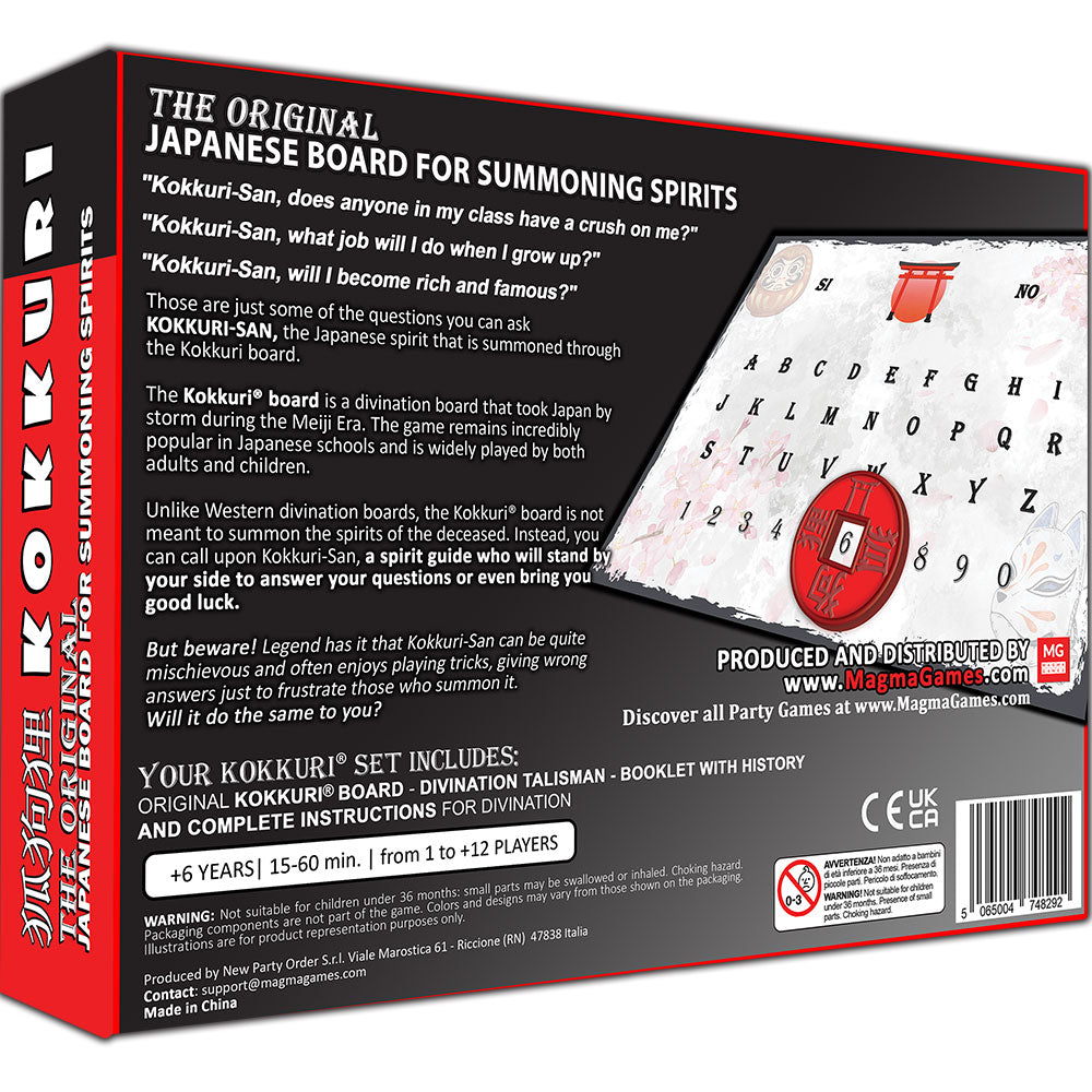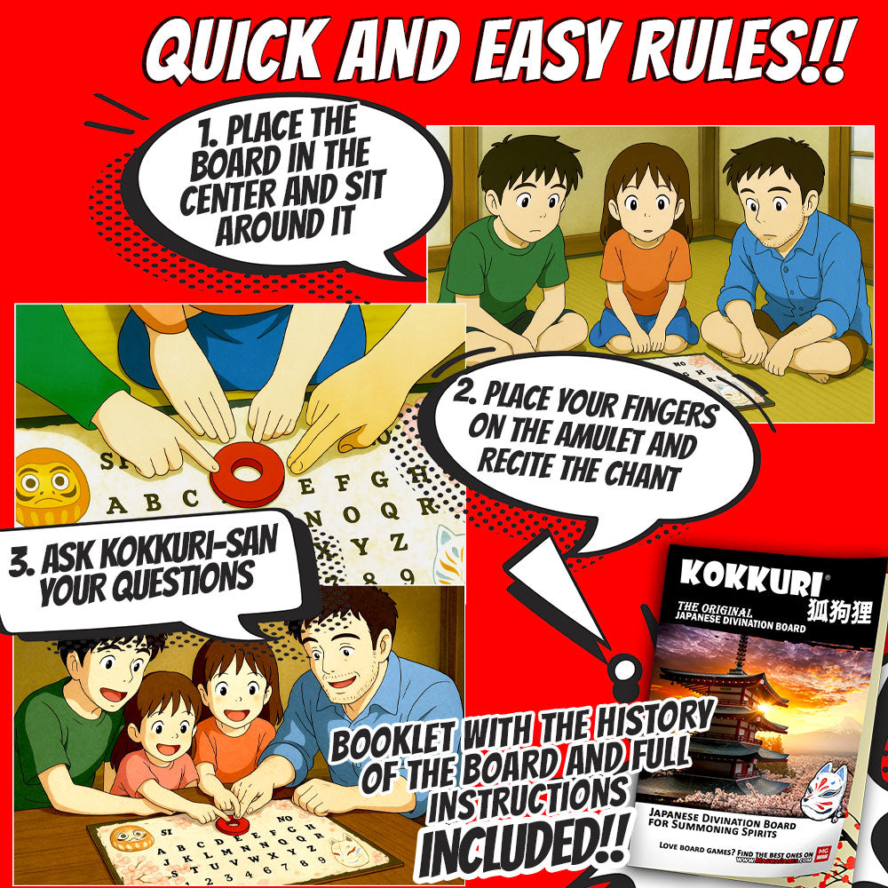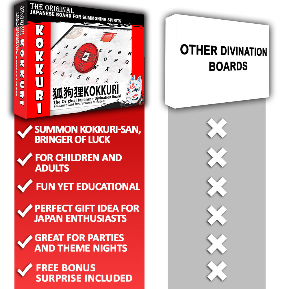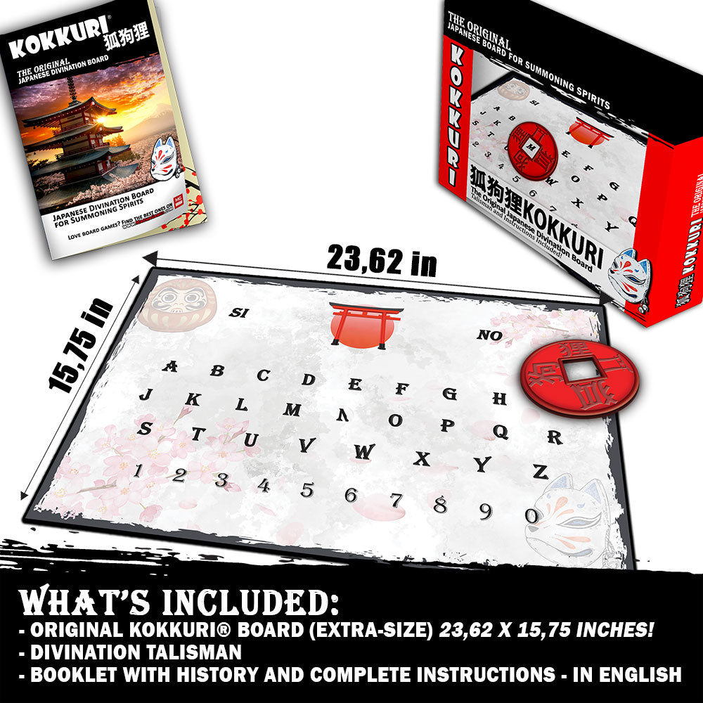 Unlike Western divination boards, the Kokkuri® board is not meant to summon the spirits of the deceased. Instead, you can call upon Kokkuri-San, a spirit guide who will stand by your side to answer your questions or even bring you good luck.